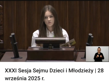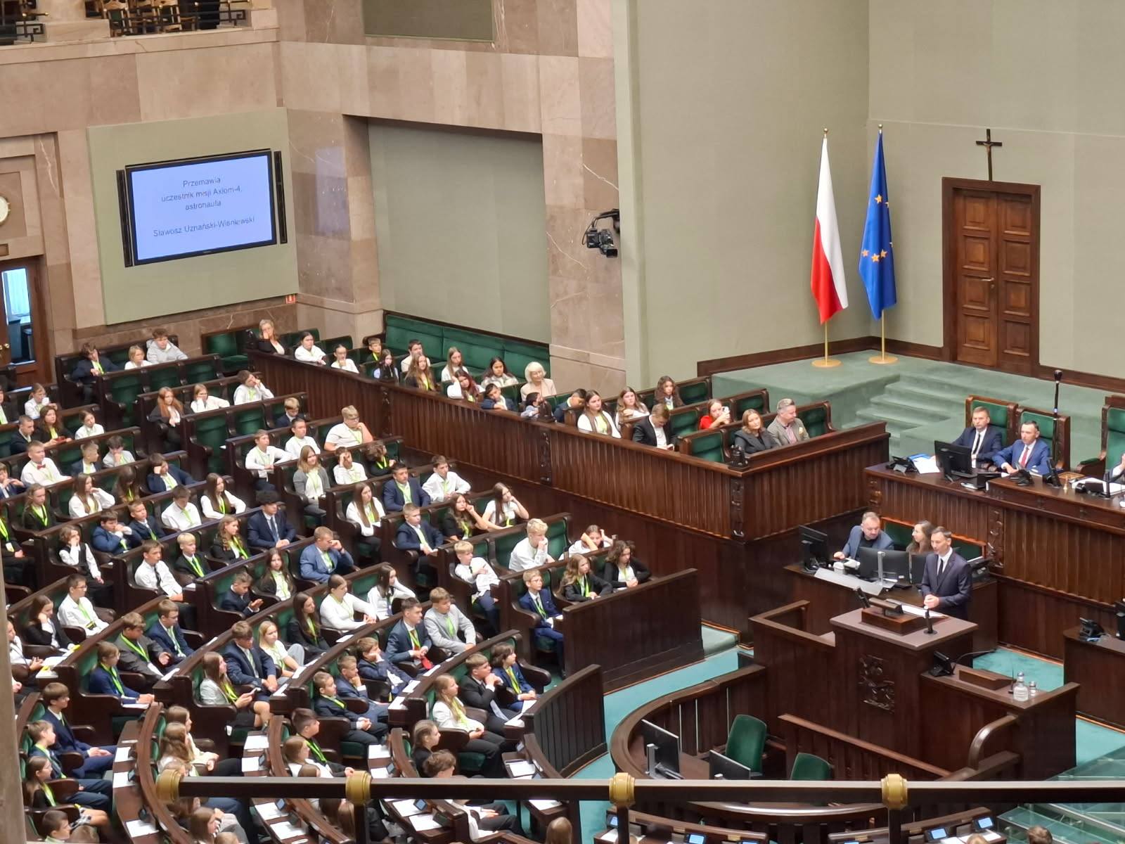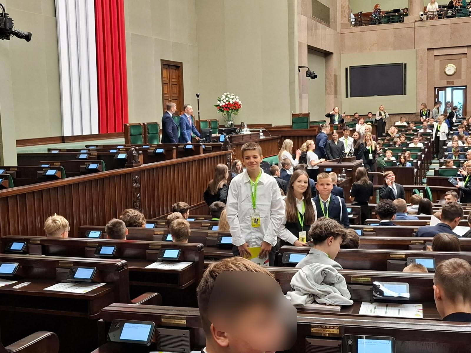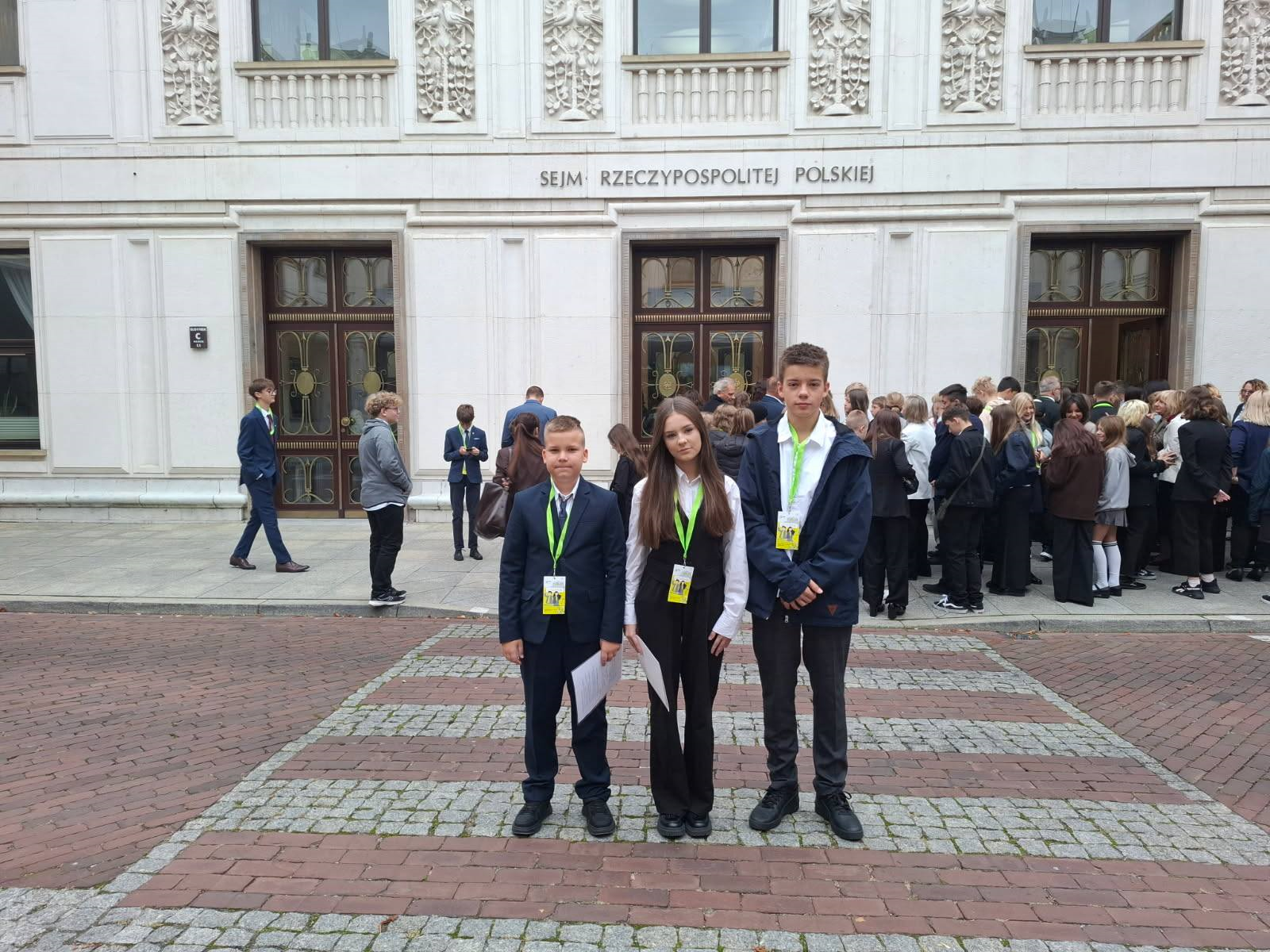 28.09.2025r. nasi uczniowie – Liwia Wojtkiewicz, Kacper Majchrowski i Ksawery Machnik – wraz z panią Renatą Maroszek, nauczycielem historii, wzięli udział w obradach Sejmu Dzieci i Młodzieży w Warszawie.