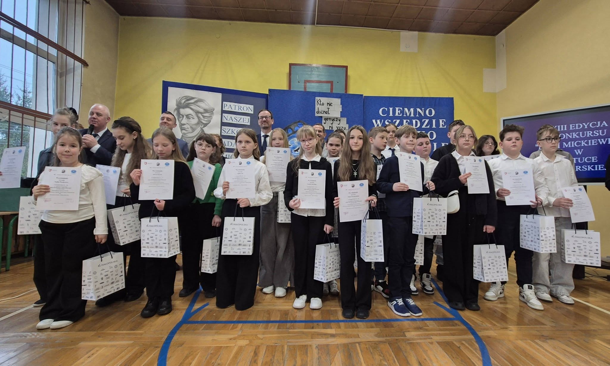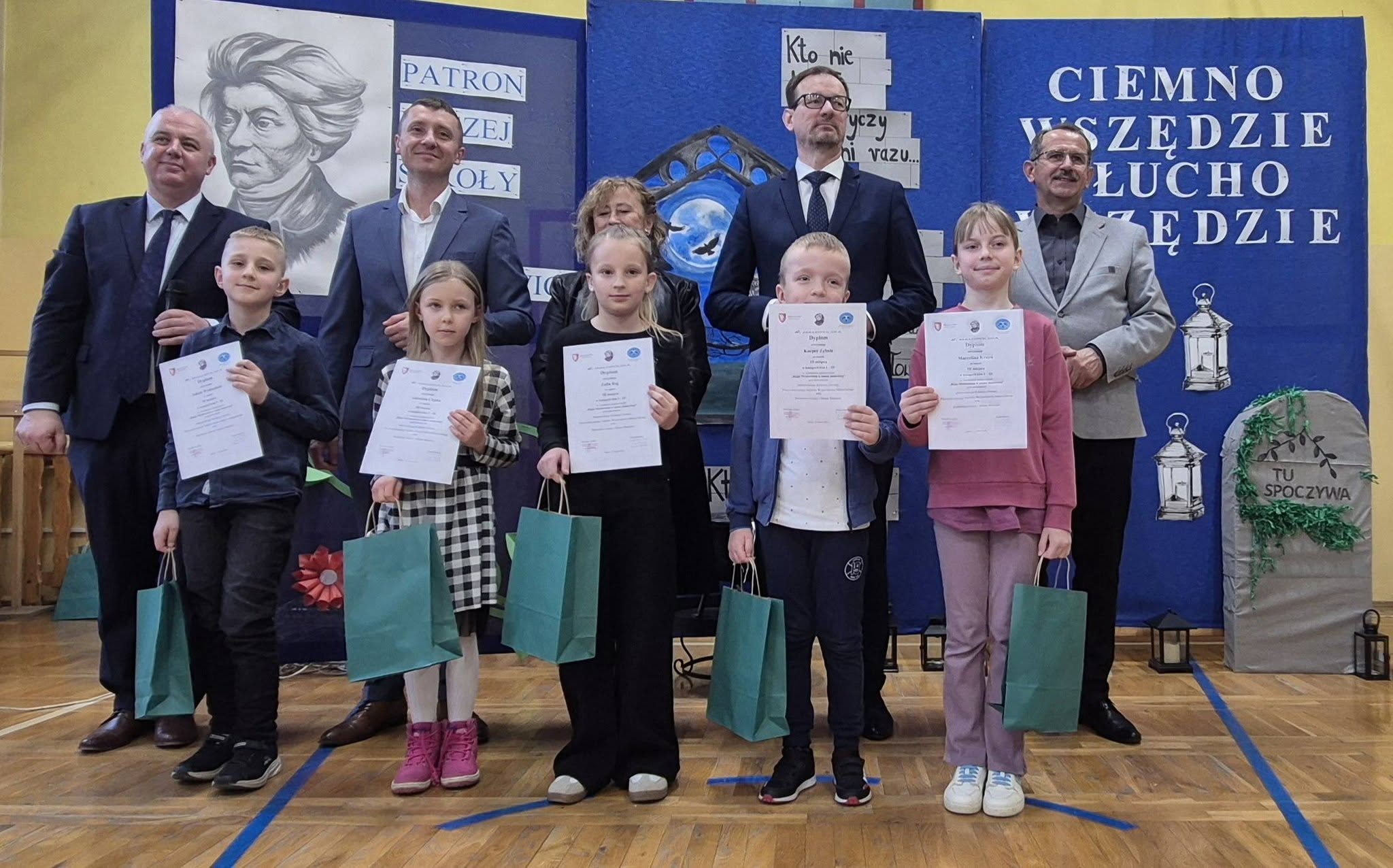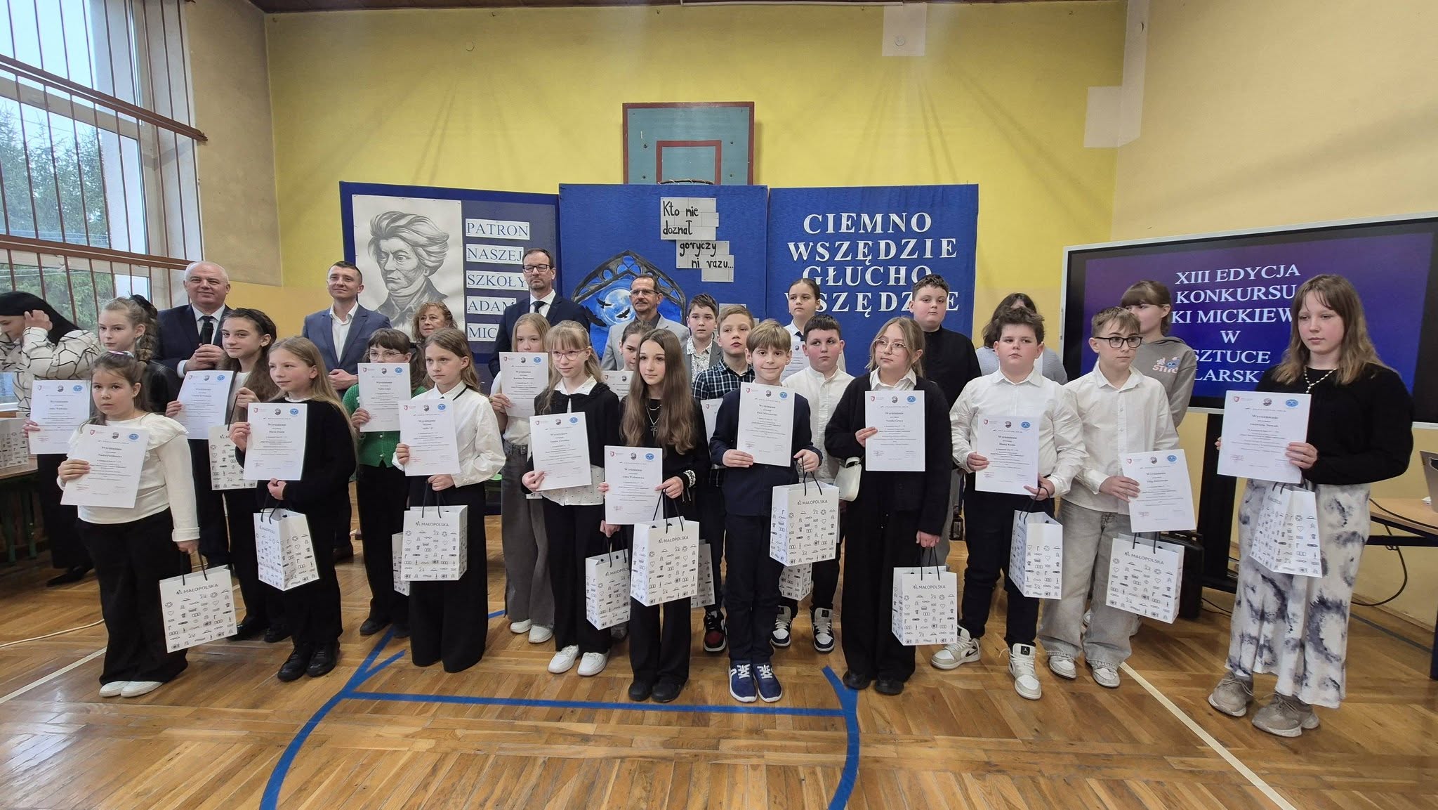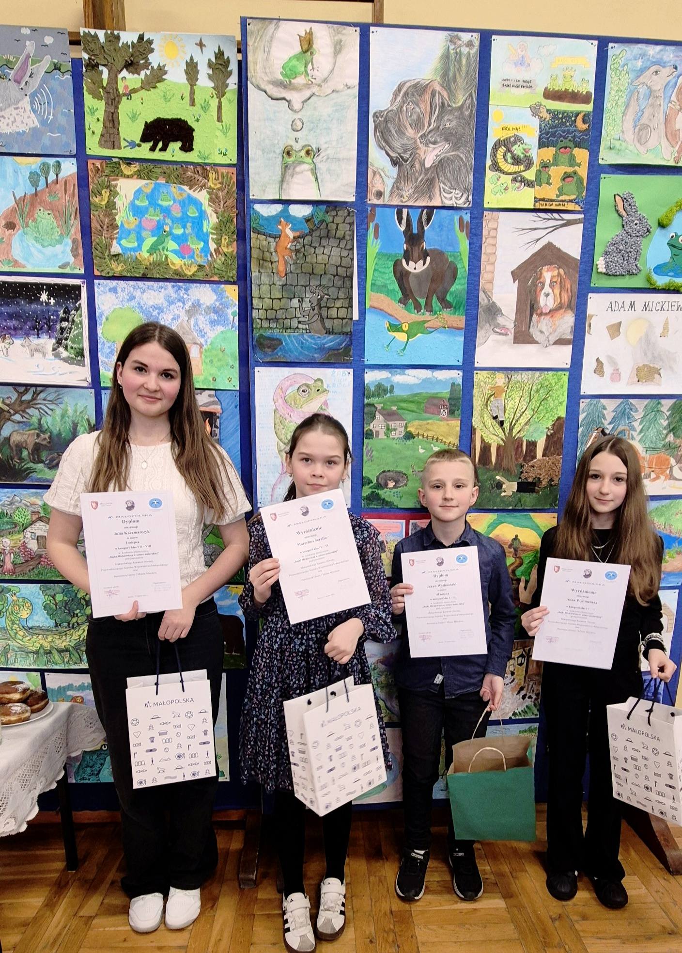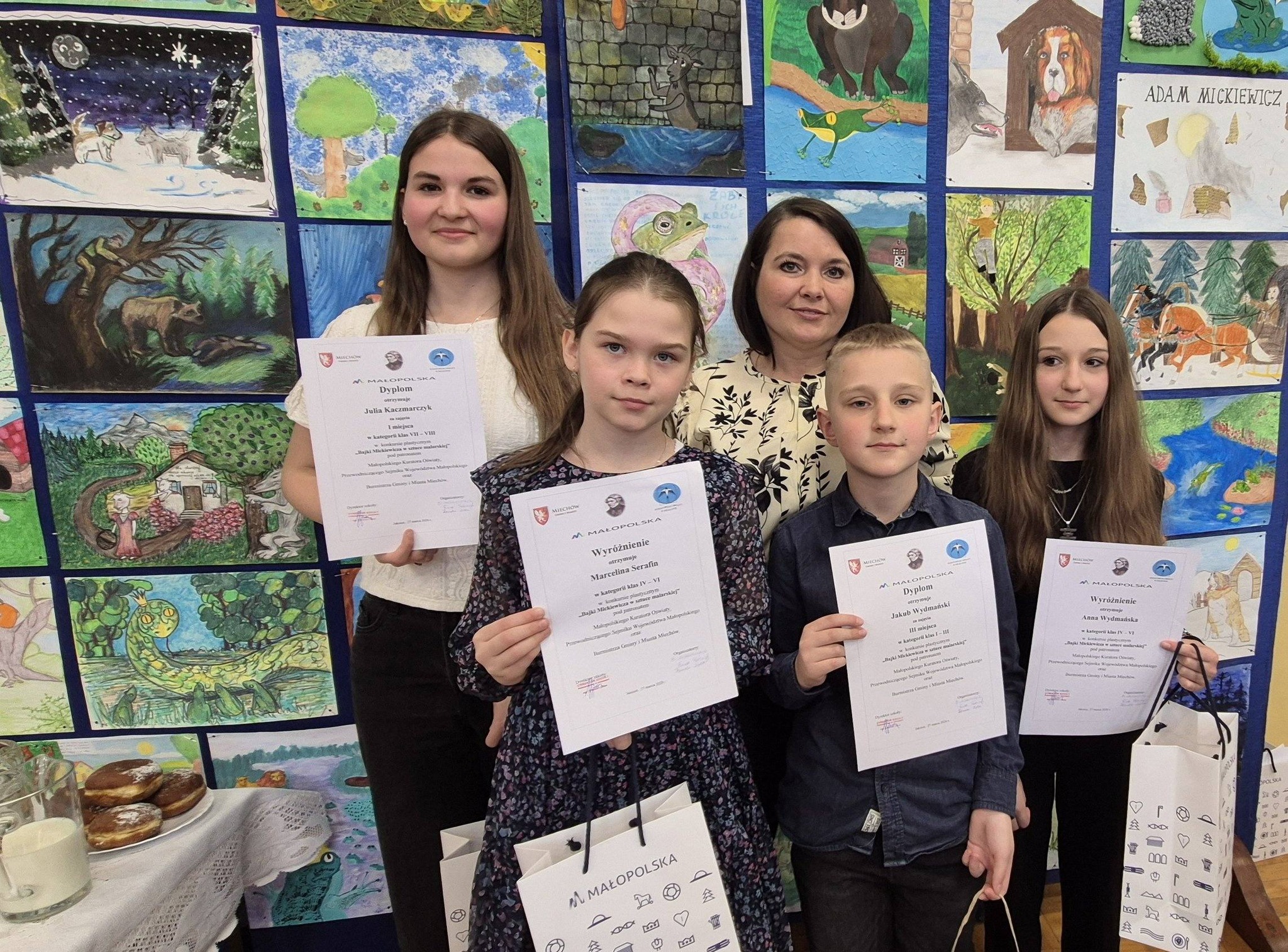 Z ogromną radością informujemy o wspaniałych osiągnięciach naszych uczniów w cyklicznym konkursie plastycznym o zasięgu wojewódzkim pt. „Bajki Adama Mickiewicza w sztuce malarskiej”. Konkurs organizowany jest przez Szkołę Podstawową im. Adama Mickiewicza w Jaksicach pod patronatem Małopolskiego Kuratora Oświaty, Przewodniczącego Sejmiku Województwa Małopolskiego oraz Burmistrza Gminy i Miasta Miechów.