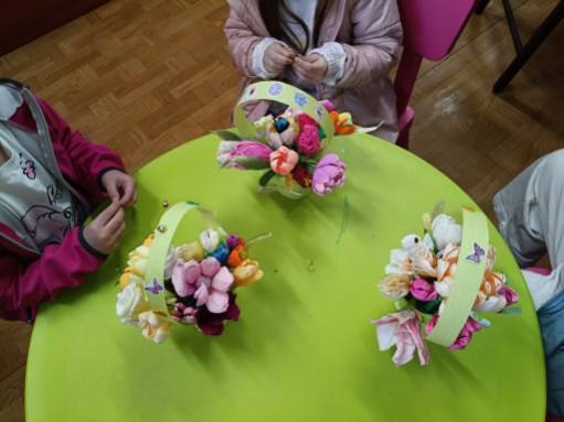 Następnie odbyła się część plastyczna – dzieci z zaangażowaniem tworzyły wiosenne koszyczki, rozwijając swoją kreatywność i zdolności manualne. W trakcie zajęć odbyła się rozmawowa o oznakach wiosny oraz o tym, gdzie możemy je zaobserwować w naszym najbliższym otoczeniu.