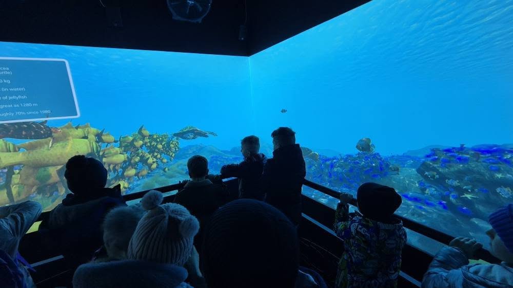 Kolejnym punktem programu był symulator 5D, w którym dzieci mogły przeżyć niezwykłe przygody na rafie koralowej oraz w kosmosie. Dzięki specjalnym efektom wizualnym i dźwiękowym, uczniowie poczuli się jak prawdziwi eksploratorzy odległych zakątków świata i kosmosu, co było nie tylko zabawą, ale także świetną okazją do nauki o środowisku morskimi i kosmicznymi.